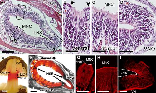 Figure 3. The nasal cavity of the C. pyrrhogaster. A: Coronal section of the middle portion of the nasal cavity stained with hematoxylin and eosin. Lateral view is given on the right and ventral view is at the bottom. The nasal cavity is a pair of flattened single chambers and consists of the main nasal chamber (MNC) and lateral nasal sinus (LNS). B–D: Higher magnifications of the olfactory epithelium (OE; B: ventral, C: dorsal) and vomeronasal organ (VNO; D) in boxes b, c, and d, respectively, in A. Note the ridges of nonsensory epithelium (NSE; arrowheads in B) separating the clusters of sensory epithelial cells. E: Dorsal view of the telencephalon exposed to label the olfactory nerve bundle (ONB) and nasal epithelium with DiI placed on the main olfactory bulb (MOB) and accessory olfactory bulb (AOB). Dark materials on the rostral end of the telencephalon are DiI crystals placed in excess. F: Coronal section of the middle portion of the nasal cavity. Note that the ventral, dorsal OE and VNO were divided by the distinct NSE. G: Sensory neurons of the ventral OE often interspaced with NSE. H: Sensory neurons of the dorsal OE. I: Sensory neurons of the VNO. VN, vomeronasal nerves. G–H are from a specimen treated as in E. Dashed lines indicate the outlines of the epithelia. Scale bar = 500 μm in A; 100 μm in B–D; 1 mm in E; 200 μm in F; 50 μm in G–H. |