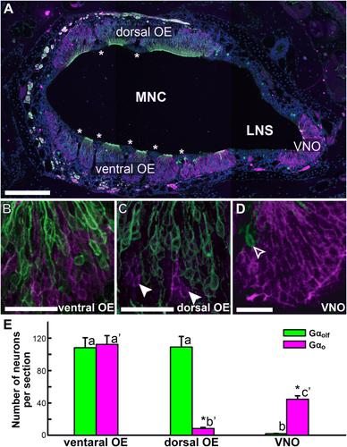 Figure 4. Distribution of Gαolf- and Gαo-immunoreactive cells in the nasal cavity of C. pyrrhogaster. A: Distribution of Gαolf- (green) and Gαo-expressing neurons (magenta) in the middle portion of the cavity: This region consists of three types of sensory epithelium surrounding the main nasal cavity (MNC) or the lateral nasal sinus (LNS): the ventral olfactory epithelium (OE), dorsal OE, and vomeronasal epithelium. This section was counterstained with 4′-6-diamidino-2-phenylindole (DAPI; blue). Asterisk represents the nonsensory epithelium (NSE) interspacing the dorsal and ventral OE. B: Higher magnification image of the ventral OE: Clusters of sensory neurons constituting a double-layered structure. Gαolf-immunoreactive cell bodies are situated in the apical side and Gαo-immunoreactive cell bodies in the basal side of the cluster. C: The dorsal OE: Sensory epithelium consists of a large number of Gαolf-immunoreactive neurons (green) situated on the apical side and a small number of Gαo-immunoreactive neurons on the basal side (magenta; arrowheads). D: The vomeronasal organ (VNO): Sensory epithelium consists of abundant Gαo-immunoreactive neurons (magenta) and a few Gαolf-immunoreactive neurons (green; outlined arrowhead). Co-localization of the Gαolf and Gαo signals were not observed in any epithelium examined. E: Mean number of immunopositive neurons per section in each epithelium. Each column and vertical bar represents the mean of measurements of sections from eight different animals and SEM, respectively. Asterisk represents significant difference between the numbers of the Gαolf- and Gαo-immunoreactive cells within each epithelium. Values with different letters differ significantly at the 5% level in numbers of G protein–positive cells among the epithelia. Scale bar = 500 μm in A; 100 μm in B–D. |