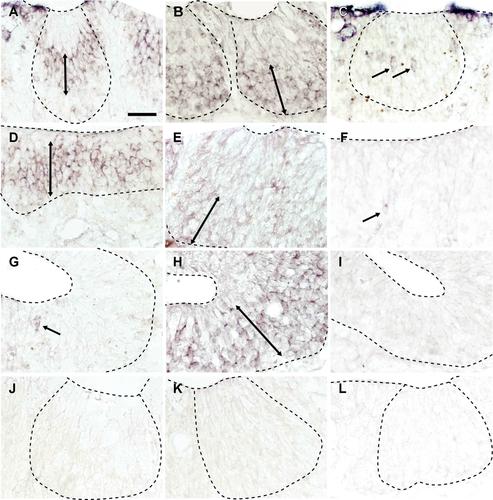 Figure 5. Expression of Gαolf, Gαo, and Gαi2 mRNAs in the nasal epithelium as demonstrated by in situ hybridization. A–I: Sections of the olfactory epithelium (OE); ventral (A–C), dorsal (D–F), and the vomeronasal organ (VNO; G–I) were hybridized with an antisense Gαolf, Gαo, or Gαi2 probe. J–L: As negative controls, sections of the ventral olfactory epithelium were hybridized with a sense Gαolf, Gαo, or Gαi2 probe. Gαolf-expressing cells lined the apical zones of the neuroepithelium (a two-headed arrow in A and D) and the VNO (arrow in G), whereas Gαo-expressing cells were located in the basal zones of the neuroepithelium (double-headed arrow in B, E, and H). A small number of Gαi2-expressing cells were also observed in the ventral OE and a lower number in the dorsal OE (arrows in C and F), but no signals were found in the VNO (I). No positive signals were seen in the ventral OE when hybridized with sense probes (J–L). Dashed lines indicate the boundaries of the neuroepithelia. Scale bar = 50 μm in A (applies to a–L). |
