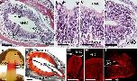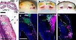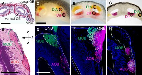 Figure 8. The axonal projections of the sensory neurons. A: Coronal section of the nasal cavities. This region consists of three types of sensory organs: the ventral olfactory epithelium (OE), dorsal OE, and vomeronasal organ (VNO). B: Horizontal section of the telencephalon stained with hematoxylin and eosin. Lateral view (l) is on the right side and caudal view (c) is at the bottom. Glomeruli in both the main olfactory bulb (MOB) and accessory olfactory bulb (AOB) were eosinophilic. M, medial; r, rostral. C: The cross-sectioned upper jaw with the dorsal OE and VNO surgically exposed, embedded in agar. The neural tracers DiI and DiA were placed on the indicated positions (circled) of the VNO and dorsal OE, respectively. D: The VNO neurons labeled with DiI (magenta) projected their axons exclusively toward the AOB, whereas the dorsal OE neurons labeled with DiA (green) projected their axons to the MOB but not to the AOB. ONB, olfactory nerve bundle. E: The cross-sectioned upper jaw with the dorsal OE and ventral OE exposed. DiI and DiA were placed on the indicated positions (circled) of the ventral OE and dorsal OE, respectively. F: Projection of the sensory neurons in the OE to the MOB and AOB. The dorsal OE sensory neurons labeled with DiA (green) projected their axons to the MOB but not to the AOB, and the ventral OE sensory neurons labeled with DiI (magenta) projected their axons to the middle and caudal MOB and the AOB. Note the difference in the distribution between the axon terminals of the dorsal OE and those of the ventral OE. ONB contained axons of both the dorsal and ventral sensory neurons labeled with DiA and DiI, respectively. Axons projecting toward the AOB were derived from the ventral OE. G: The cross-sectioned upper jaw with the ventral OE and VNO exposed. DiI and DiA were placed on the indicated positions (circled) of the ventral OE and VNO, respectively. H: The ventral OE neurons labeled with DiI (magenta) projected their axons to the caudal MOB and the AOB, whereas the VNO neurons labeled with DiA (green) projected their axons exclusively toward the AOB. There were no apparent differences in the distribution pattern between the axon terminals of the ventral OE and those of the VNO. Sections in D, F, and H were counterstained with DAPI (blue). Dashed lines indicate the area of the glomeruli. Scale bar = 2 mm in A and C (applies to C, E, G); 300 μ in B and D (applies to D,F,H). |