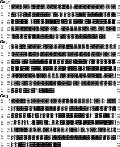 Figure 2. Partial nucleotide sequences of a cDNAs encoding the olfactory G proteins. The nucleotide sequences of partial cDNAs for C. pyrrhogaster (Cp) Gαolf, Gαo, and Gαi2 that correspond to X. laevis (Xl) Gαolf (GenBank accession number AJ296281), Gαo (GenBank accession number X14636), and Gαi2 (GenBank accession number NM001097056), respectively. Identical nucleotides in Cynops and Xenopus cDNAs are in black boxes. |