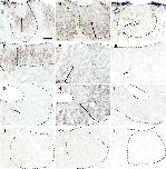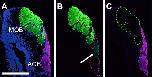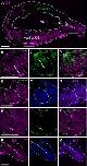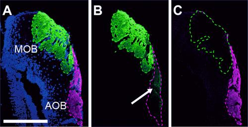 Figure 9. Distribution of Gαolf- and Gαo-expressing neurons in the brain. A: Horizontal section of the telencephalon: Gαolf-immunoreactive fibers (green) converged on the glomeruli of the main olfactory bulb (MOB). Gαo-immunoreactive fibers (magenta) converged on the glomeruli of the accessory olfactory bulb (AOB). B: Nonmerged image of Gαolf-immunoreactive fibers. Note that a small number of immunoreactive fibers was observed in the AOB (arrow). C: Nonmerged image of Gαo-immunoreactive fibers. The fibers did not project into the MOB. Sections in A were counterstained with DAPI (blue). Dashed lines indicate the area of the glomeruli. Scale bar = 500 μm in A (applies to A–C). |