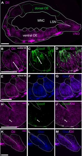 Figure 10. Retrograde tracing of Gαolf- and Gαo-expressing neurons from the accessory olfactory bulb (AOB). A: Sensory epithelial cells labeled by DiI placed on the AOB. The labeled cells were localized in the ventral olfactory epithelium (OE) and vomeronasal organ (VNO) but not in the dorsal OE. B–G: Higher magnification of the ventral OE. DiI labeled the olfactory sensory neuron clusters in the ventral OE (B, E). Gαolf-immunoreactive cells were situated in the apical area (C). Merged image of DiI labeled and Gαolf-immunoreactive cells: co-localization of DiI and Gαolf signals was not observed in the ventral OE (D). Gαo-immunoreactive cells were distributed in the basal area (F). Merged image of DiI-labeled and Gαo-immunoreactive cells in the ventral OE (G): co-localization of DiI and Gαo signals was evidenced. H–M: Higher magnification of the VNO. DiI-labeled cells were distributed in the whole area of the VNO (H, K). A small number of Gαolf-immunoreactive cells were found in the VNO (I). Merged image of DiI-labeled and Gαolf-immunoreactive cell in the VNO (J): among the dominantly existing DiI-labeled cells, quite a few cells were also Gαolf-immunoreactive (arrows). DiI-labeled cells (K) and Gαo-immunoreactive cells (L) were widely distributed in the VNO. Merged image of DiI-labeled and Gαo-immunoreactive cells (M): DiI-labeled cells coincided well with the cells exhibiting Gαo-immunoreactive signals. Dashed lines indicate the outlines of the sensory epithelia. Scale bar = 200 μ in A, B (applies to B–D), E (applies to E–G), H (applies to H–J), and K (applies to K–M). |