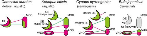 Figure 11. Schematic representation of diversified olfactory system in amphibians. Gαolf (green)- and Gαo (magenta)-expressing olfactory receptor neurons in the OE and/or VNO and their axonal projection toward MOB and/or AOB in X. laevis, C. pyrrhogaster, and B. japonicus. For comparison, the pattern of distribution and projection of Gαolf- and Gαo-expressing neurons in the goldfish, Carassius auratus, is also presented. OE, olfactory epithelium; MOB, main olfactory bulb; VNO, vomeronasal organ; AOB, accessory olfactory bulb. References: C. auratus: Hansen et al., 2004, 2005. X. laevis: Saito and Taniguchi, 2000; Hagino-Yamagishi et al., 2004; Date-Ito et al., 2007. C. pyrrhogaster: this study. B. japonicus: Hagino-Yamagishi and Nakazawa, 2011. |