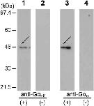 Figure 1. Specificity of anti-Gαolf and anti-Gαo antibodies. Tissue extract from the mixture of olfactory epithelium (OE) and vomeronasal epithelium (VNE) of the female newt Cynops pyrrhogaster was subjected to western blot analysis. Lane 1, stained with anti-Gαolf. Lane 2, negative control with anti-Gαolf omitted. Lane 3, stained with anti-Gαo. Lane 4, negative control with anti-Gαo omitted. Arrows indicate the specific bands. |