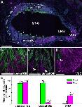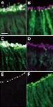 Figure 6. Double-labeling immunohistochemistry for G proteins and acetylated tubulin (AcT). A: Merged image of Gαolf- (green) and AcT-immunoreactive signals (magenta) in the ventral olfactory epithelium (OE). B: Merged image of Gαo- (green) and AcT-immunoreactive signals (magenta) in the ventral OE. C: Merged image of Gαolf- (green) and AcT-immunoreactive signals (magenta) in the dorsal OE. D: Merged image of Gαo- (green) and AcT-immunoreactive signals (magenta) in the dorsal OE. E: Merged image of Gαolf- (green) and AcT-immunoreactive signals (magenta) in the vomeronasal organ (VNO). No significant AcT- and Gαolf-immunoreactive signals at the epithelial surface (dashed line) of the VNO were observed. F: Merged image of Gαo- (green) and AcT-immunoreactive signals (magenta) in the VNO. The white-colored image at the surface of the ventral and dorsal neuroepithelial regions (A, C) indicates the overlapping of immunoreactive signals on the cilia labeled with anti-AcT with those labeled with anti-Gαolf. Gαo-immunoreactive olfactory knob-like structures are invariably immunonegative for AcT (B, F). Scale bar = 10 μm in A (applies to A–F). |
