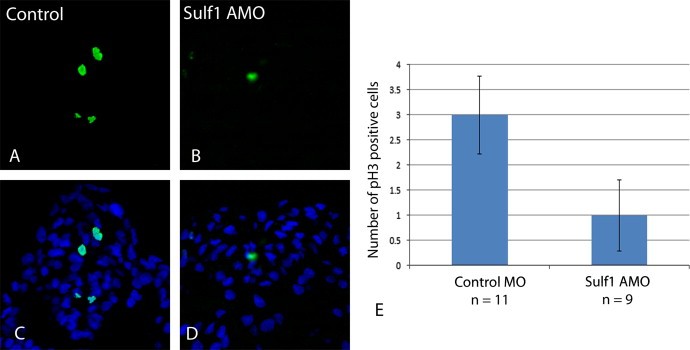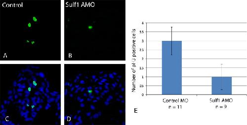Fig. 3. Sulf1 is required for normal proliferation in the neural tube. (A, C) Antibody staining for the mitotic cell marker phosphor-Histone3 (pH3) reveals the normal number of cells in mitosis in the neural tube at NF stage 22 (n=11, range from 2 to 4 pH3 positive cells, average 3, median 3, standard deviation 0.77). (B, D) Antibody staining for pH3 when Sulf1 is knocked-down (n=9, range 0 to 2 cells, average 1, median 1, standard deviation 0.71). (E) Graph of the data where the reduction in pH3 positive cells in embryos lacking Sulf1 compared to controls is significant (Student׳s t-test P<0.0001). |