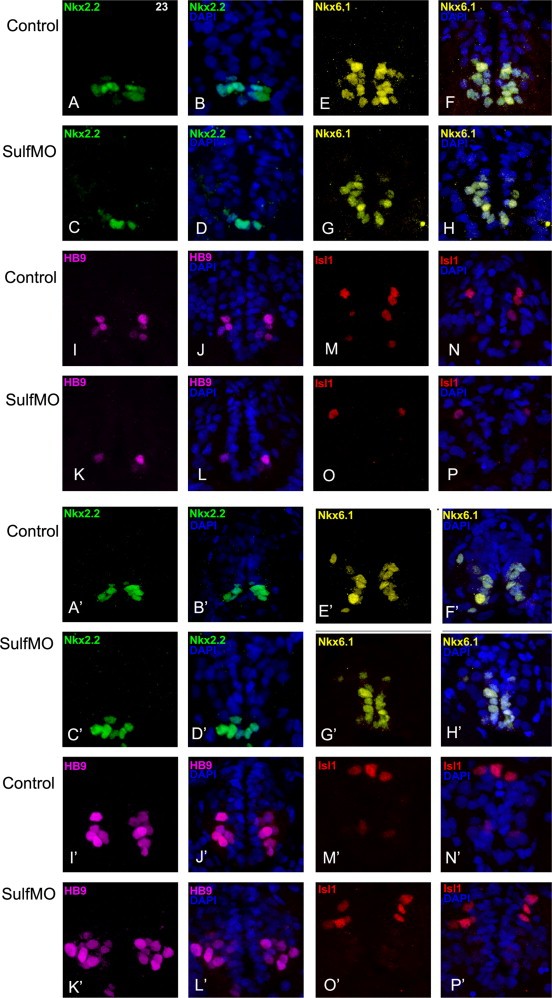 Fig. 2. Sulf1 is required for correct DV patterning in the vertebrate neural tube. Immunostaining for Nkx2.2 (AâD), Nkx6.1 (EâH), HB9 (IâL) and Isl1 (MâP) in control (A, B, E, F, I, J, M, N) and Sulf1 knockdown (C, D, G, H, K, L, O, P) X. tropicalis embryos at stages 23 (AâP) and stage 40 (Aâ²âPâ²). At stage 23, the expression of Nkx2.2 is shifted ventrally in Sulf knockdown embryos (C, D; n=12, 75%) compared with controls (A, B; n=8, 100%). At stage 40, the expression of Nkx2.2 is also shifted ventrally in Sulf knockdown embryos (Câ², Dâ²; n=18, 67%) compared with controls (Aâ², Bâ²; n=11, 100%). Sulf1 knockdown only leads to a small change in Nkx6.1 expression at stage 23 (G, H; n=8, 63%), compared to controls (E, F; n=8, 100%). At stage 40 the expression of Nkx6.1 is shifted ventrally (Gâ², Hâ²; n=20, 70%), compared to controls (E,â² Fâ²; n=12, 100%). HB9 staining similarly reveals differences between the stages, at stage 23, the expression of HB9 is reduced (K, L; n=12, 75%) compared with controls (I, J; n=7, 100%). Cells positive for HB9 in Sulf1 knockdown embryos increases at stage 40 (Kâ², Lâ²; n=19, 69%). At stage 23, the expression of Isl1 reduced in the MN domain of Sulf knockdown embryos (O, P; n=8, 63%) compared with controls (M, N; n=12, 100%); whereas at stage 40 Isl1 is not reliably detectable in this domain in Sulf1 knockdowns (Oâ², Pâ²; n=2, 100%) or in controls (Mâ², Nâ²; n=5, 100%). |