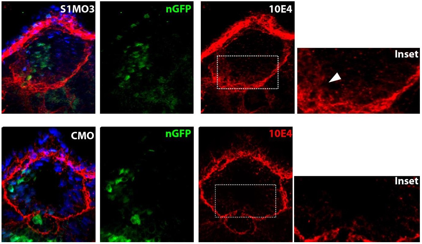 Once sectioned, samples were washed in PBS, and blocked for 1hr at room temperature in PBS+ 0.5%BSA. Samples were incubated in 1:200 anti-10E4 (US Biological) for 24 hours and washed in PBS. Alexa 555 conjugated goat anti mouse (Invitrogen) was used at 1:500 and Alexa488 conjugated anti-GFP (Invitrogen) was used at 1:1,000. Samples were mounted in Vectashield mounting medium with DAPI. |
