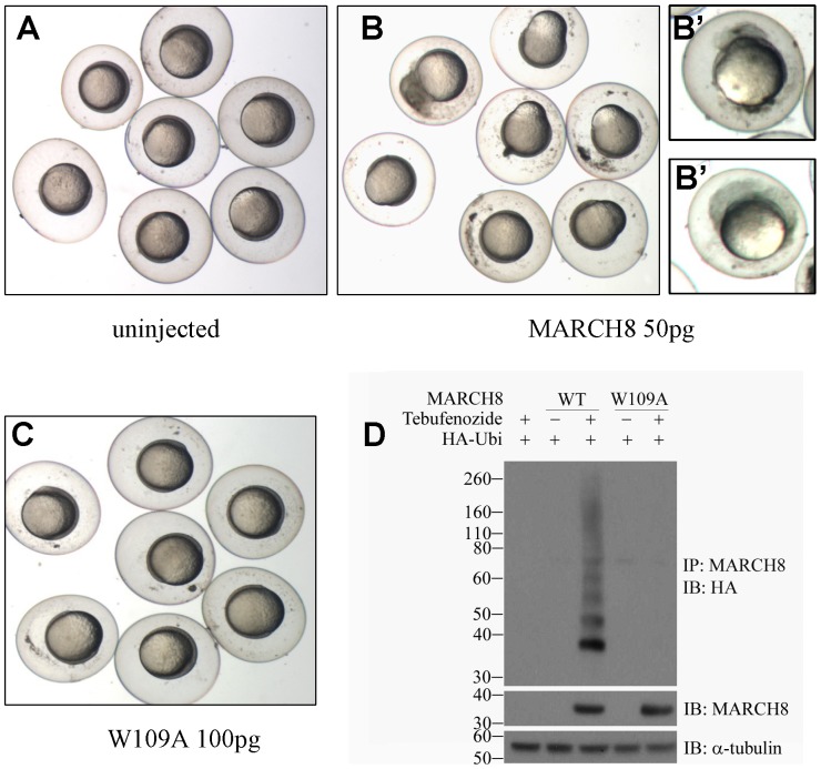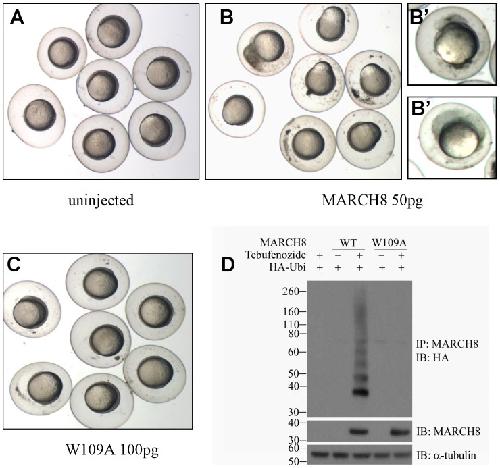 Figure 2. Overexpression of march8 mRNA induces early embryonic death.(AâC) Uninjected embryos (A), and embryos injected with WT march8 mRNA (B) or RING domain mutant (W109A) march8 mRNA (C), at shield to 60% epiboly stage. Overexpression of March8 results in loss of cell adhesion, abnormal cell migration, and cell death (B); individual embryos showing disaggregation of embryonic cells are shown in Bâ². Embryos injected with W109A mutant mRNA were normal (C). (D) Self ubiquitination of March8. HEK293T cells were transfected with the plasmids indicated and activated by addition of tebufenozide (see Materials and Methods). Lysates were immunoprecipitated (IP) with anti-March8 antibody and then immunoblotted (IB) with anti-HA antibody to detect ubiquitinated proteins (upper panel). Expression of March8 and tubulin as control are shown in bottom panels.