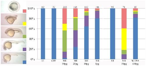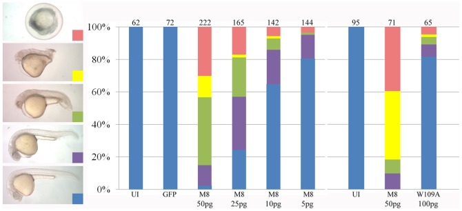 Figure 3. The RING domain of March8 is critical for induction of embryonic defects.The classification of morphological defects at 26 hpf after march8 mRNA injection is shown at the left. Quantification shows that defects were induced in a dose-dependent manner by WT, but very weakly by W109A mutant march8 mRNA. Number of embryos is listed on top of bars. UI, uninjected; GFP, embryos injected with 50 pg GFP mRNA.
