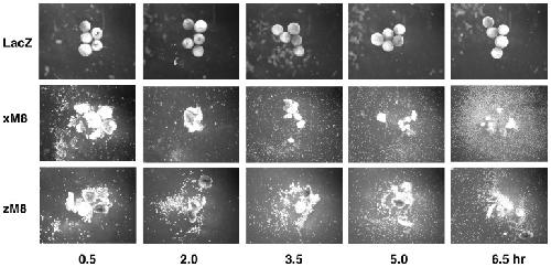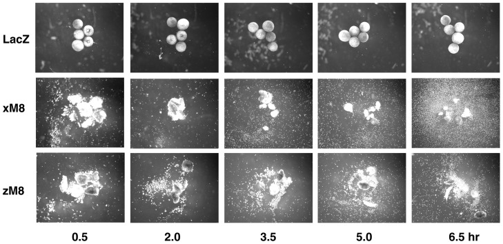 Figure 4. March8 induces cell dissociation in Xenopus animal caps.Xenopus embryos were injected with 400LacZ, Xenopus march8 or zebrafish march8 mRNA. Animal caps were dissected and incubated as described in Materials and Methods. Caps were photographed at the indicated times after being placed in dissociation media.
