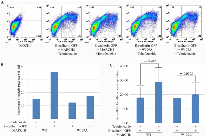 Figure 6. March8 overexpression reduces cell surface expression of E-cadherin in cultured cells.(A) HEK293T cells were transfected with plasmids encoding E-cadherin-GFP, and inducible March8 WT or W109A mutant. After 12 h, cells were treated for 8 h with tebufenozide to induce March8 expression or maintained without the drug, as indicated (see Figure 7 for induction efficiency). For membrane E-cadherin staining, non-permeablized cells were stained using an antibody to an extracellular epitope (red). Cells were analyzed by flow cytometry in red (Y axis; surface E-cadherin) and green channels (X axis; total E-cadherin). Thus the upper right quadrant represents cells with E-cadherin at the surface, while the lower right quadrant represents non-surface (intracellular) E-cadherin. (B, C) Fraction of total E-cadherin that is intracellular. The data from the experiment in (A) are shown in (B). Panel (C) shows the average intracellular E-cadherin measured in 20 separate flow cytometry experiments. Induction of WT March8 led to an increase in intracellular E-cadherin that is highly significant, whereas induction of the W109A mutant did not lead to a significant change (student's T test).