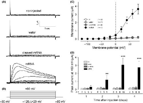 Figure 2. Expression of exogenous ion currents by injection of oocytes with mRNA isolated from Giardia lamblia. (A) Representative series of traces of current obtained from oocytes under the distinct experimental conditions indicated on the legends, they all are depicted at the same magnitude indicated in the scale bar at the top. Currents were obtained in response to series of squared voltage pulses that as shown in (B) were from −120 up to +80 mV in steps of 20 mV from a holding level of −80 mV. (C) Relationship between the maximal current amplitude and the test voltage from oocytes injected with intact mRNA as well as noninjected or mock injected. Dots indicate the average value (±SE) of the number of individual oocytes assayed that the inset indicates. (D) Time course of the expression of currents after days of injection. Bar length indicates the mean value of peak current in response to a voltage pulse of +60 mV.