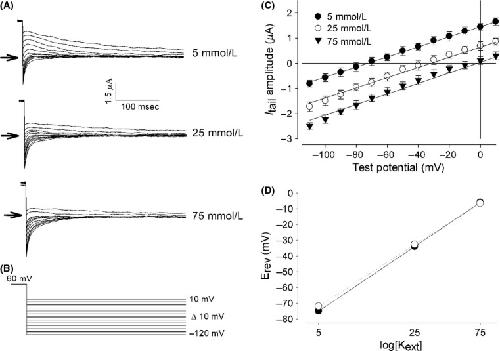 Figure 3. External K+ dependence of reversal potential. (A) Series of tail currents, at distinct external K+ concentrations, obtained from an oocyte injected with mRNA, in response to a stimulus protocol that, as depicted in (B), after a conditioning pulse of +60 mV, varies test voltage from −120 up to 10 mV in steps of +10 mV. (C) The relationship between the tail current amplitude and the test voltage shows a linear trend and shifts right when potassium is increased on the external media, as expected for a K+ selective pathway. (D) Semi‐log10 plot of the calculated reversal potential versus the external K+ concentration (empty circles) follows a linear trend with a slope of 55 mV per tenfold increase of K+, a value nonsignificantly distinct from the ideal value of 59 mV per tenfold (filled circles).