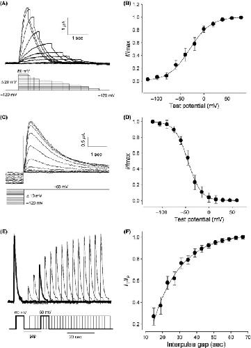 Figure 4. Kinetic properties of mRNA‐induced K+ currents. (A), (C), and (E) show in the upper part representative series of currents obtained from oocytes injected with Giardia lamblia mRNA in response to the voltage stimulus protocols indicated in the lower part. (A) In order to determine the voltage dependence of its activation, the instant magnitude of the tail current was measured at each test potential. (B) The standardized value of such current was averaged (25 oocytes from 3 frogs) and plotted against the test potential. (C) To determine the voltage dependence of the steady‐state inactivation, the peak value of current was measured at +60 mV after prepulses of variable voltage. (D) The mean value (23 oocytes from 3 frogs) of the standardized peak current plotted against the test voltage produces a sigmoid relationship. (E) Representative current traces from a protocol designed to determine the time recovery of inactivation. (F) Time‐dependent recovery of inactivation. To obtain this plot, the peak magnitude of the current of the second pulse was divided by the peak magnitude of the current of the first pulse and the average value of this ratio (from 18 oocytes) was plotted against the interpulse time lapse. This relationship follows an asymptotically exponential rise with a time constant of 40.5 sec.