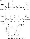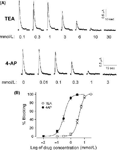 Figure 5. Effect of TEA and 4AP on Giardia lamblia′s‐mRNA‐induced K+ currents. (A) Representative traces showing the effect of K channel blockers TEA (top) and 4‐AP (bottom). Ion currents were elicited by a pulse of +60 mV (for 10 sec, from a holding of −80 mV) while oocytes were in a media containing drugs in increasing concentrations. From such recordings a %blocking index was calculated by referring the peak current at each drug concentration to the peak current without drugs. (B) In both cases the averaged% blocking (15 oocytes from 3 frogs each) shows a sigmoidal trend when values are plotted against the log10 of drug concentration.