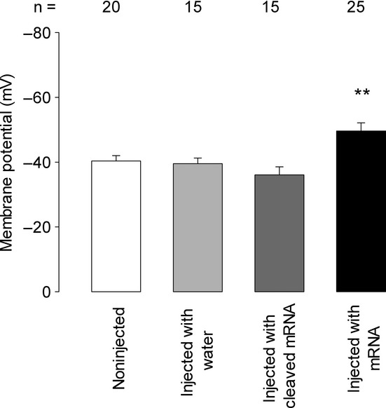 Figure 1. Effect of Giardia lamblia mRNA injection on the membrane potential (Em) of Xenopus oocytes. Bar length indicates the mean value (±SE) of membrane potential of individual mature oocytes that were either noninjected or injected with water, degraded mRNA or intact mRNA. Negative values are shown upward for convenience. Em measurements were made on oocytes 3 days after injection. **P < 0.005 for a t‐test, comparing noninjected versus injected with mRNA. Numbers above bars indicate number of cases. Multiple comparisons test (Tukey) showed no statistically significant difference among noninjected values with neither injected with water nor injected with degraded mRNA.