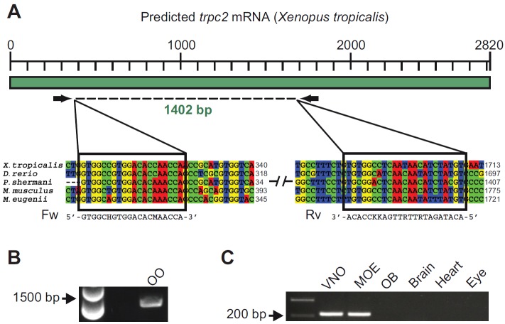 Fig. 1. Cloning of trpc2 and analysis of tissue-specific expression. (A) Schematic representation of the predicted trpc2 transcript of Xenopus tropicalis and degenerate primers used for the PCR shown in B. Two fragments of the trpc2 multi-species alignment are shown below. The black boxes highlight the conserved regions chosen to design the degenerate primers. (B) Touchdown RT-PCR with degenerate primers (see A). An amplification product of 1402 bp was detected in the olfactory organ (OO) including both the main olfactory epithelium (MOE) and the vomeronasal organ (VNO). The obtained fragment was sequenced, and in BLAST searches (http://blast.ncbi.nlm.nih.gov/) gave the best score with the predicted X. tropicalis trpc2 sequence (90% nucleotide identity). (C) For analysis of tissue specificity, an RT-PCR (35 cycles) for trpc2 was performed with specific primers (see Materials and methods) under stringent conditions. OB, olfactory bulb. An amplification product of the expected size was detected in the VNO and MOE, whereas no signal was detected from other organs.