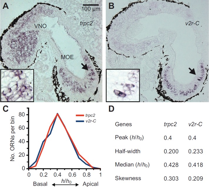 Fig. 2. Distribution of trpc2-positive cells closely mimics that of v2r-C-expressing cells in the MOE. (A) Cryosections of larval Xenopus laevis were hybridized with antisense probes for the trpc2 gene. The micrograph shown is from a horizontal section of larval head tissue, which contains both the MOE and the VNO. A zone of trpc2-positive cells was detected in the MOE and widespread labeling was visible in the VNO. The arrow is pointing at the region enlarged in the inset. (B) Cryosections of larval head tissue were hybridized with antisense probes for the v2r-C gene. Orientation and region as explained in A. Consistent with previous results (see Syed et al., 2013), v2r-C-positive cells were only found in the MOE, and occupy a discrete zone there. The arrow is pointing at the region enlarged in the inset. (C) Basal-to-apical distribution (0, most basal; 1, most apical position) of trpc2 (314 cells, 5 sections) and v2r-C-expressing cells [data taken from Syed et al. (Syed et al., 2013) and shown here for comparison]. Data are given as mid-bin values (0.1 bin size); y-axis shows total number of cells per bin. (D) Characteristic parameters for the distribution of trpc2-expressing cells; values for v2r-C taken from our earlier work (Syed et al., 2013) are shown for comparison.