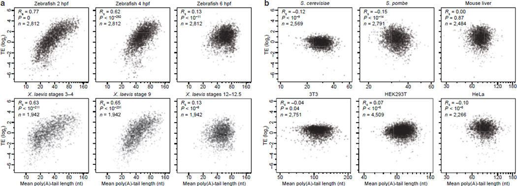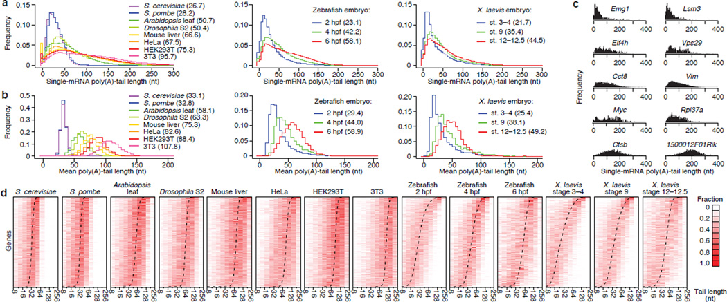 Poly(A) tails enhance the stability and translation of most eukaryotic messenger RNAs, but difficulties in globally measuring poly(A)-tail lengths have impeded greater understanding of poly(A)-tail function. Here we describe poly(A)-tail length profiling by sequencing (PAL-seq) and apply it to measure tail lengths of millions of individual RNAs isolated from yeasts, cell lines, Arabidopsis thaliana leaves, mouse liver, and zebrafish and frog embryos. Poly(A)-tail lengths were conserved between orthologous mRNAs, with mRNAs encoding ribosomal proteins and other 'housekeeping' proteins tending to have shorter tails. As expected, tail lengths were coupled to translational efficiencies in early zebrafish and frog embryos. However, this strong coupling diminished at gastrulation and was absent in non-embryonic samples, indicating a rapid developmental switch in the nature of translational control. This switch complements an earlier switch to zygotic transcriptional control and explains why the predominant effect of microRNA-mediated deadenylation concurrently shifts from translational repression to mRNA destabilization.