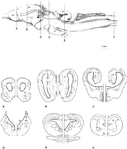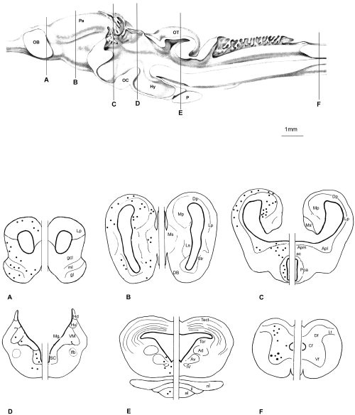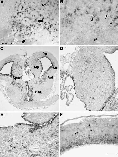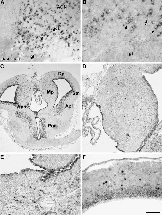 Figure 4. Distribution of CB1 mRNA labeling in the different layers of the olfactory bulb and anterior olfactory nucleus (A,B, longitudinal parasagittal sections). Some lightly stained periglomerular cells are shown in the glomerular layer of the olfactory bulb; some positive cell bodies are seen in the anterior olfactory nucleus. Intensely labeled cell bodies occur in the mitral and tufted cell layer as well in the granule cell layer (A). Positive cell bodies of different sizes are shown in more detail within the layer containing both mitral (arrows) and tufted cells (arrowhead) (B). A transverse section of the prosencephalon (C) shows abundant positive cell bodies distributed throughout the pallium and subpallial sites of the telencephalon such as amygdaloid nucleus and striatum. An intense staining is also observed in the anterior preoptic nucleus. Higher magnifications of CB1 mRNA-positive neurons in the medialpallium (D), in the pars medialis of the amygdaloid nucleus (E), and in the dorsal pallium (F). A: anterior; AON: anterior olfactory nucleus; Apl: amygdala pars lateralis; Apm: amygdala pars medialis; Dp: dorsal pallium; gcl: granule cell layer; gl: glomerular layer; ml: mitral cell layer; Mp: medialpallium; P: posterior; Poa: anterior preoptic nucleus; Str: striatum. Scale bars = 80 μm in A, 40 μm in B, 450 μm in C, 140 μm in D, 80 μm in E and F.