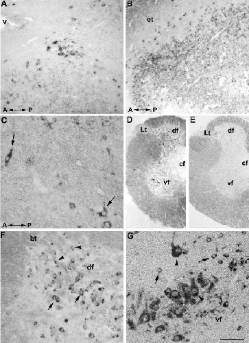 Figure 5. CB1 mRNA containing neurons in the eminentia thalami (A) and periventricular gray of the retrochiasmatic hypothalamus (B; the ventricular lumen, at the right, is not visible in the micrograph) (longitudinal parasagittal sections). In the ventral mesencephalic tegmentum positive cell bodies of different sizes are seen; two bipolar neurons with dorsoventrally oriented processes are indicated by arrows (C, longitudinal parasagittal section). The distribution of the CB1 mRNA-positive cell bodies in the spinal cord is shown in a transverse hemisection, cervical level (D). A transverse hemisection of the spinal cord, adjacent to D, processed for negative control, does not show any labeling (E). Numerous small (arrowheads) and medium-sized (arrows) neurons express CB1 receptor mRNA in the dorsal field (F). Labeled motor neurons (arrowheads) and smaller cells (arrows) are observed in the ventral field of the spinal cord (G). A: anterior; cf: central field; df: dorsal field; Lt: Lissauer's tract; ot: optic tract; P: posterior; v: ventricle; vf: ventral field. Scale bars = 100 μm in A, 120 μm in B, 40 μm in C, 220 μm in D and E, 50 μm in F and G.