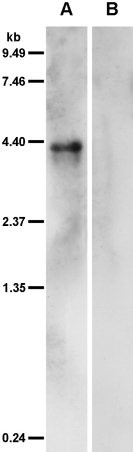 Figure 1. Northern blotting analysis of Xenopus laevis brain total RNA. Hybridization with a CB1 antisense RNA probe allowed to identify a single band of ∼4.3 kb (A). Hybridization with a negative control RNA probe failed to give any signal (B). Numbers on the left indicate RNA molecular weight standard migration.