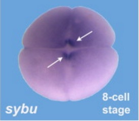 sybu (syntabulin) gene expression in Xenopus laevis embryo, NF stage2 (2-cell) , as assayed by in situ hybridization, vegetal view.