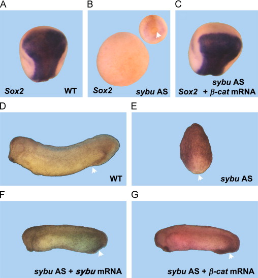 Fig. 5. The Syntabulin maternal depletion phenotype is rescued by sybu mRNA or by β-catenin mRNA. (A) Expression of the neural plate marker Sox2 in wild type early neurula embryos, n=16/16. (B) Syntabulin maternal depletion eliminated almost all Sox2 expression, with the exception of a weak residual ring of expression around the blastopore (inset, arrowhead), n=15/15. (C) Injection of β-catenin mRNA at 4-cell stage efficiently rescued expression of Sox2 in sybu depleted host transfer embyos, n=12/12. (DâG) The sybu AS ventralized phenotype was rescued both by syntabulin-UTR+ mRNA (n=7) and by β-catenin mRNA (n=12) at the tailbud stage.