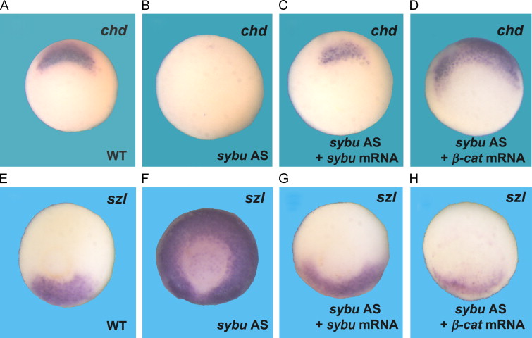 Fig. 6. Rescue of D-V patterning genes in Syntabulin-depleted embryos by syntabulin or β-catenin mRNA injection. (A) Expression of the Spemann organizer marker chordin (n=13/13) in wild type embryos at stage 10. (B) Chordin is eliminated by maternal depletion of syntabulin (n=9/9). (C) Injection of sybu mRNA partially rescues its own depletion (n=6/10), demonstrating specificity of the knock-down. (D) chordin expression is rescued, and somewhat expanded with respect to wild type, by β-catenin mRNA (n=14/14). (EâH) Maternal depletion of syntabulin increases expression of the ventral marker sizzled and this is counteracted by the injection of syntabulin-UTR+ or β-catenin mRNAs.