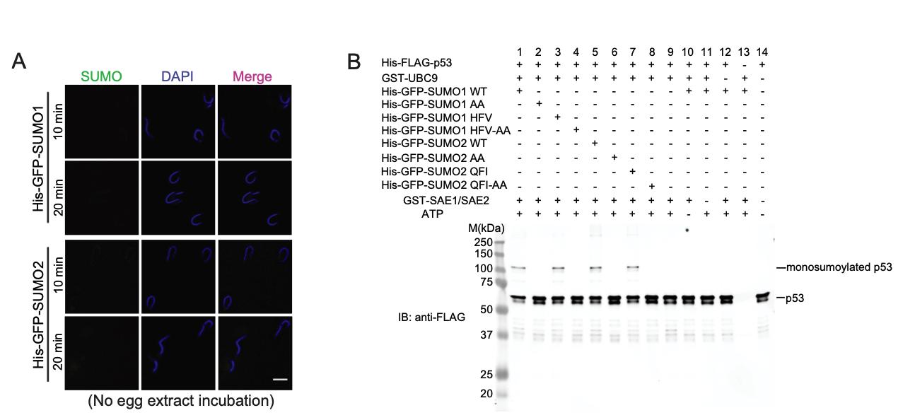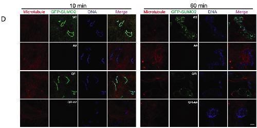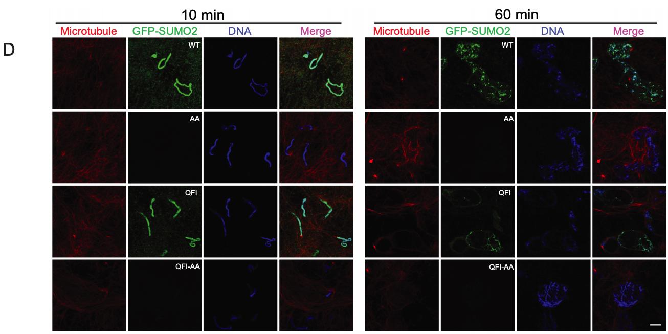 Fig. 2D, SUMO2 could be conjugated on sperm chromatin. Sperm chromatin isolated from male Xenopus was incubated with interphase Xenopus egg extracts and purified His-GFP-tagged SUMO2 mutant proteins. A strong GFP signal appeared on the chromatin with WT and QFI SUMO. No GFP signal was observed with the AA or QFI-AA SUMO mutants. Microtubule structures formed by rhodamine-labeled tubulin indicate the cell cycle stage of Xenopus egg extracts. DAPI was used for DNA staining. Scale bar equals 10um