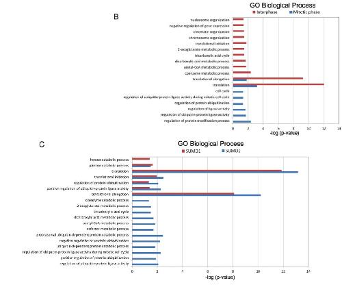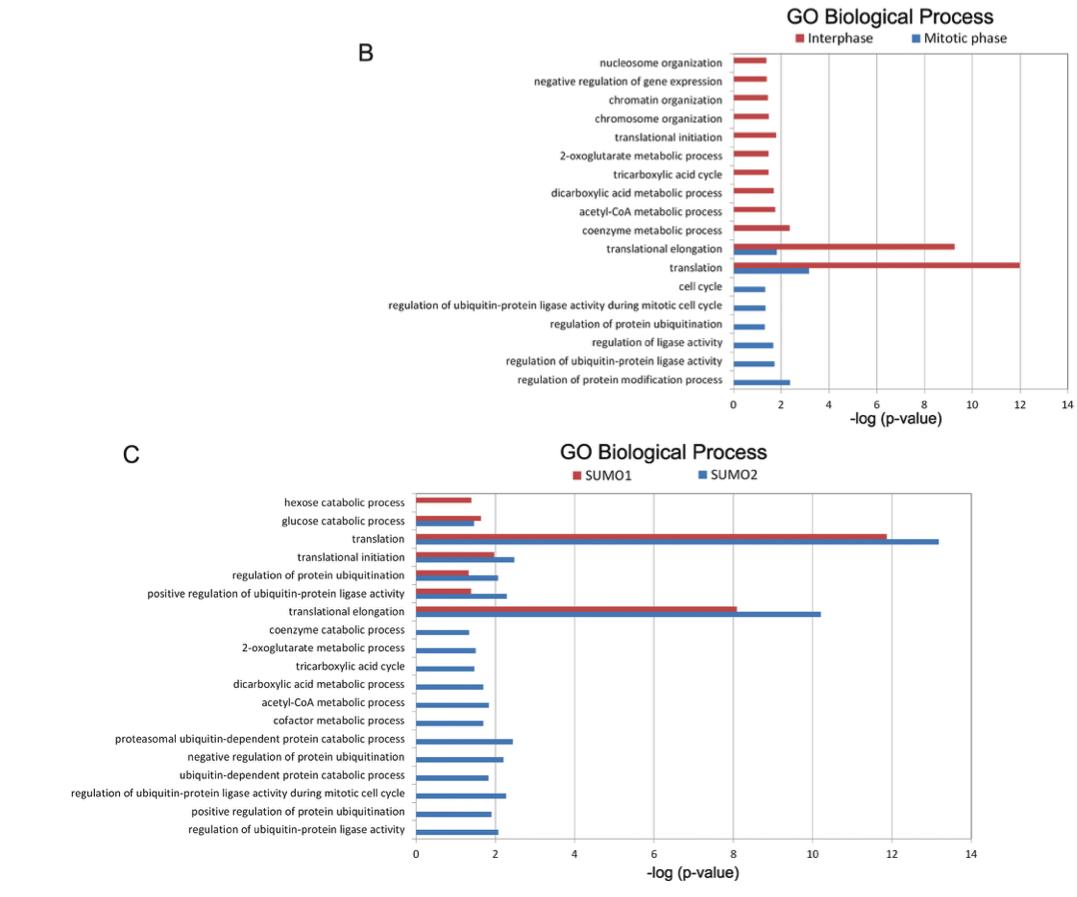 B, Bar chart showing enrichment p values of SUMO substrates identified from interphase or mitotic phase for GO Biological Process terms generated by DAVID database. C, Bar chart showing enrichment p values of SUMO1 and SUMO2 substrates for GO Biological Process terms generated by DAVID database.