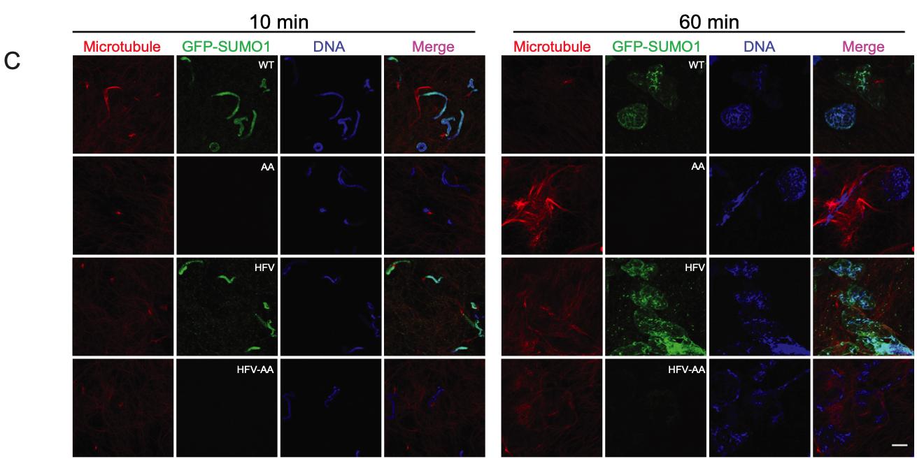 C, SUMO1 could be conjugated to sperm chromatin. Sperm chromatin isolated from male Xenopus was incubated with interphase Xenopus egg extracts and purified His-GFP-tagged SUMO1 mutant proteins. A strong GFP signal appeared on the chromatin in Xenopus egg extracts in less than 10 min and persisted even after the nuclear formation in WT and HFV groups. No GFP signal was observed on sperm chromatin with the AA or HFV-AA SUMO mutants. Microtubule structures formed by rhodamine-labeled tubulin indicate the cell cycle stage of Xenopus egg extracts. DAPI was used for DNA staining. Scale bar equals 10um