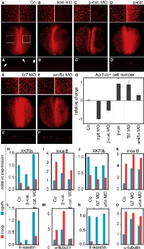 (A) quantification of Figure 4Aâ-Fâ showing relative Ac-tubulin positive cell number per embryo section. n>10 embryos per condition and >200 Ac- tubulin positive cells for each uninjected embryo side. Error bars, s. d. (B) α-tubulin in situ hybridization followed by cryo section in neurulae. (Bâ) quantification of (B). For each bar, n=10. |