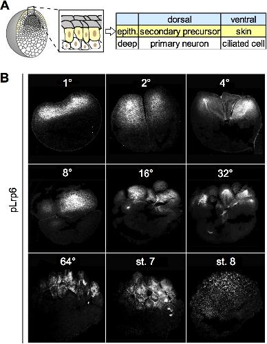(A) Scheme showing cell fates of Xenopus blastula/gastrula ectodermal cells. The outer ectodermal layer consists of epithelial cells (yellow), which are apico- basally polarized. The inner layer consists of deep cells which are unpolarized. On the dorsal side the epithelial cells give rise to secondary neuronal precursors and the deep cells to primary neurons. On the ventral side the epithelial cells give rise to goblet cells and the deep cells to multiciliated cells. The midblastula stage is shown in section to reveal the blastocoel. (Modified from K. Kalthoff, Analysis of Biological Development, 2d ed., McGraw-Hill, 2001)