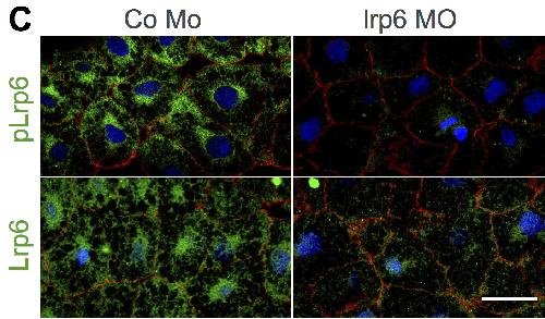 Figure S1, related to Figure 1. (C) Embryos were maternally depleted for Lrp6. Embryos were cryo-sectioned and stained for Lrp6 or pLrp6 (green) together with β1-integrin (red). Nuclei are marked in blue (Hoechst). Scale bar, 30μm. |