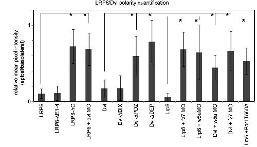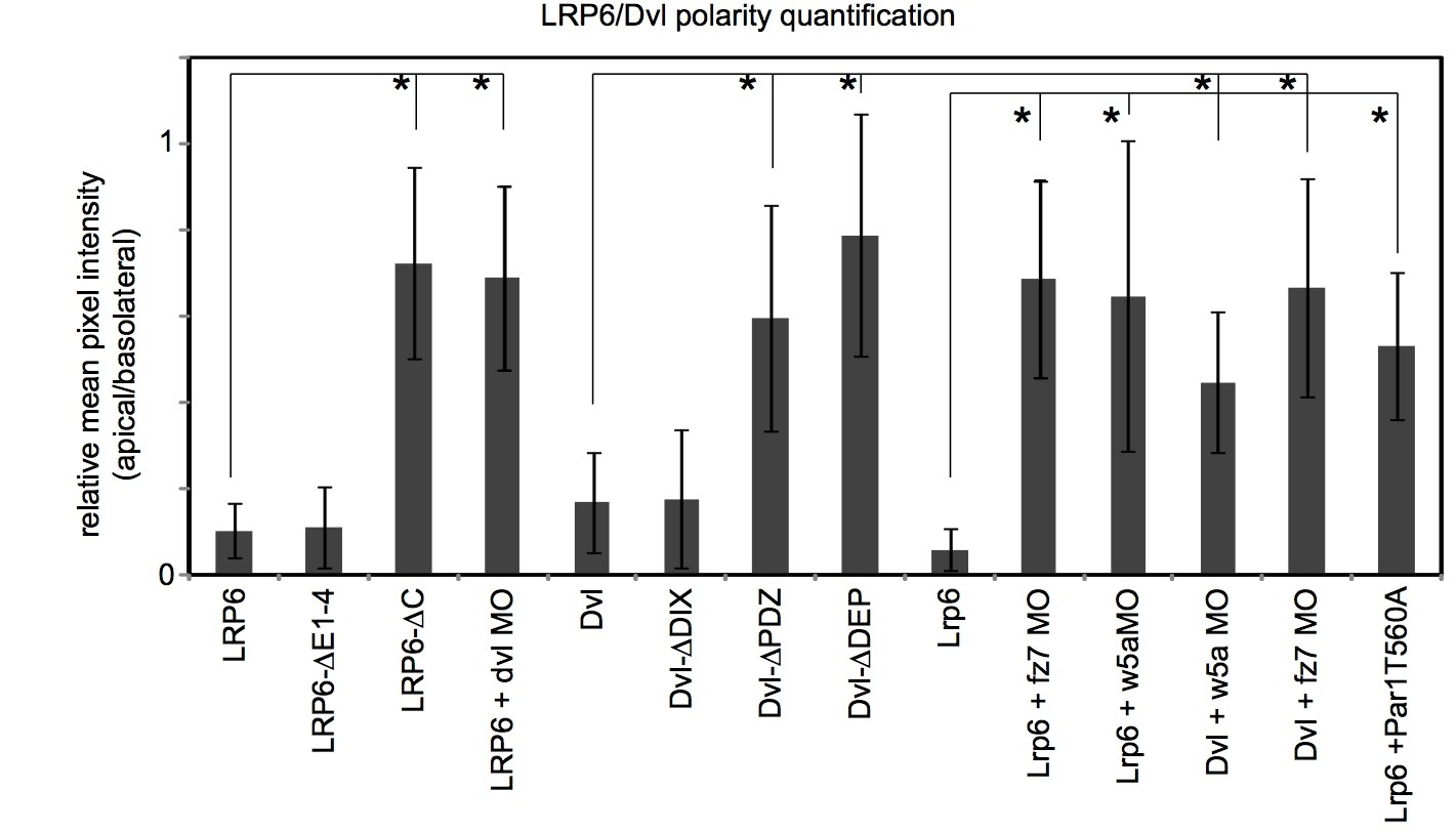 Mean pixel intensity of apical or basolateral membrane of epithelial ectodermal cells was measured by ImageJ. For each bar, n=50 cells (more than 10 embryos) analyzed; *, p<0.001 |