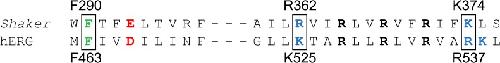 Figure 1. Highly conserved amino acids in the S2 and S4 segments. Sequence alignment of the S2 region (left) and the S4 voltage sensor (right) of Shaker and hERG channels. Conserved residues forming the putative gating charge transfer center in S2 are highlighted in green. The positive S4 residues investigated in this study are highlighted in blue. The remaining S4 charges are shown in bold font. The conserved negative residues in S2 suggested to contribute to the gating charge transfer center in Shaker channels (i.e., E293) are shown in red.