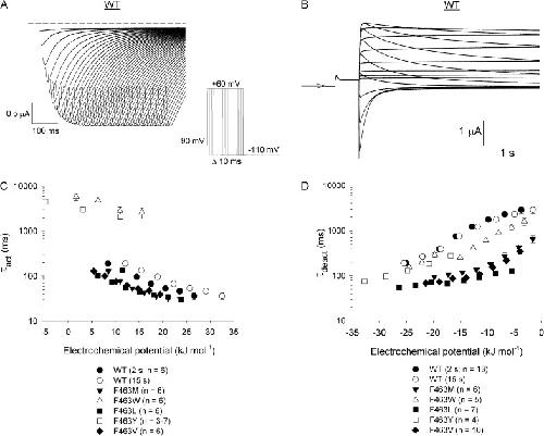 Figure 3. The F463W and F463Y mutations dramatically slow channel activation. (A) Typical WT hERG currents recorded during an envelope of tails voltage protocol (inset). For clarity, capacity transients have been removed and current traces truncated such that only the tail currents are shown. The broken line represents the zero current level. To measure τact, peak tail current amplitudes were plotted against time and fit to a single exponential function. (B) Representative currents recorded from WT hERG channels during a deactivation protocol. Oocytes were held at −80 mV, depolarized to +60 mV for 500 ms to activate the channels, and then repolarized to potentials between −110 and +60 mV for 4 s. Tail currents were fit to a double exponential function and the value for τdeact was calculated as a weighted mean of the fast and slow time constants for the current decay. (C and D) Plot of τact (C) and τdeact (D) values for WT hERG and F463 mutant channels against the electrochemical potential for channel activation and deactivation, respectively (see Materials and methods). Because slower activating channels (e.g., F463W) were recorded using 15-s pulse durations, WT hERG data were plotted twice, using electrochemical potential energies calculated with ΔG0 values derived from G-V curves obtained using both 2- and 15-s pulse durations.