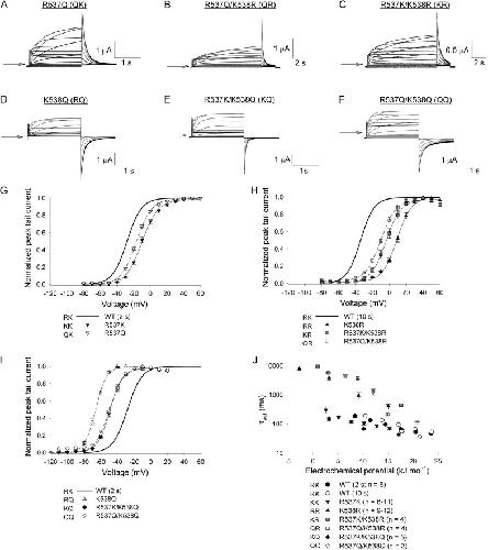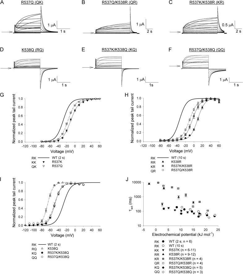 Figure 5. The positive charge at position 538 is more important than that at 537 in controlling channel activation. (A–F) Typical current recordings from oocytes expressing various R537 and K538 single and double mutations. Arrows represent the zero current level. (A–C) Oocytes were held at −80 mV and subjected to either 2-s (A) or 10-s (B and C) pulses to +60 mV in 10-mV increments; tail currents were recorded at −60 mV. (D–F) Oocytes were held at −130 mV and subjected to 2-s pulses to 0 or 20 mV in 10-mV increments; tail currents were recorded at −130 mV. (G) Comparison of the effects of R537 mutations (R/K/Q) on the G-V relationship when a Lys residue is present at position 538. (H) Comparison of the effects of R537 (R/K/Q) mutations when the residue at position 538 is an Arg. (I) Comparison of the effects of R537 mutations (R/K/Q) on the G-V relationship when a Q residue is present at position 538. Lines in G–I represent fits of the data to a Boltzmann function. n values and Boltzmann parameters are summarized in Table 1. (J) Plot of the τact values against the electrochemical potential for activation for the R537 and K538 double mutants. Data points in G–J represent mean ± SEM (error bars).