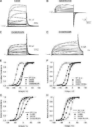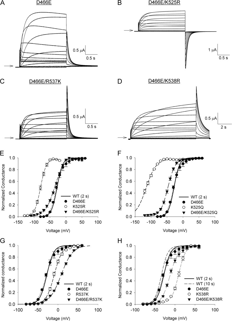 Figure 7. K525 and K538 may interact with a conserved negative charge in S2. (A–D) Representative current traces from oocytes expressing the single D466E mutation and the double D466E/K525R, D466E/R537K, or D466E/K538R mutant constructs. Oocytes were held at −80 mV and subjected to either 2- or 10-s depolarizing pulses to +60 mV in 10-mV increments. Tail currents were recorded at −60 mV. Arrows indicate the zero current level. The exception to this was D466E/K525R, which was held at −110 mV, and tail currents were recorded at −130 mV. (E) Comparison of the G-V relationships for the D466E and D466E/K525R mutants. (F) Plot of the G-V relationships for the D466E and D466E/K525Q mutants. (G) Comparison of the G-V relationships for the D466E and D466E/R537K mutants. (H) Comparison of the G-V relationships for the D466E and D466E/K538R mutants. In E–H, lines represent fits of the data to a Boltzmann function. Data points represent mean ± SEM (error bars). n values and parameters from the Boltzmann fits are summarized in Table 1.