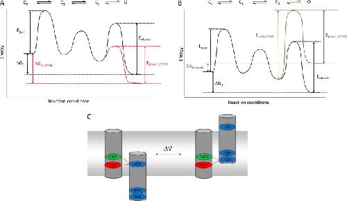 Figure 8. Schematic representation of hERG channel gating. (A) Reaction coordinate diagram for hERG gating, based on the linear gating scheme proposed by Wang et al. (1997). Activation involves transitions through three closed (C) states to a single open (O) state; the inactivated state has been omitted for simplicity. The black line represents the gating reaction for WT channels; the red line highlights possible changes caused by the K525R mutation. These include a more negative value for ΔG0 consistent with stabilization of the O state and a decrease in the energy barrier (E(deact)) for the O → C2 transition to allow for faster deactivation. (B) The same reaction coordinate diagram in A is used to highlight the possible changes to the gating reaction caused by the K538R mutation (green line). These include a positive value for ΔG0 consistent with stabilization of the closed state and a large increase in the energy barriers for transitions between the C2 and O states that allows for the increases in the values of τact and τdeact. (C) Schematic showing the proposed functional interactions between the S4 gating charges and F463 and D466 in the S2 segment. Broken lines illustrate the interaction pairs thought to occur in the resting state (left) and the activated state (right).