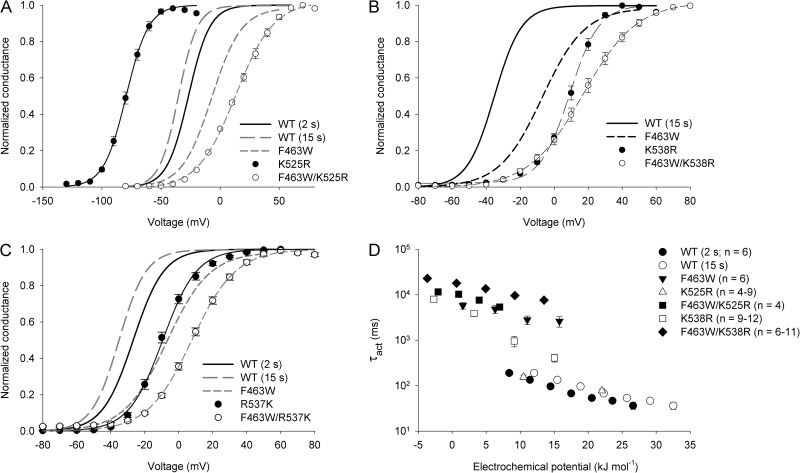 Figure 6. F463 may interact with K525 and K538 to modulate activation gating. (A) Comparison of the mean G-V relationship for the F463W/K525R double mutation with those of the single mutants. (B) Comparison of the mean G-V relationships for the F463W/K538R double mutation with those of the single mutants. (C) Comparison of the G-V relationships for the F463W/R537K double mutation with those of the single mutants. Lines in A–C represent Boltzmann function descriptions of the data; n values and Boltzmann parameters are shown in Table 1. (D) Plot of the τact values against the electrochemical potential for activation for the channel constructs described in A and B. Data points represent mean ± SEM (error bars).