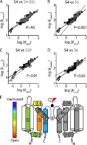 Figure 6. Perturbations to inactivation gating and activation gating show poor correlation for S4 residue mutations. Plot comparing perturbations to ΔG0, versus WT, of inactivation gating (ΔΔG0Inact, represented by Δlog(Keq,0)) compared with perturbations to ΔG0, versus WT, of activation gating (ΔΔG0Activ; see Materials and methods) for each S4 residue mutation. Solid black line represents linear regression analysis constrained to go through WT, whereas dashed gray line is an unconstrained fit (R2 = 0.38). |