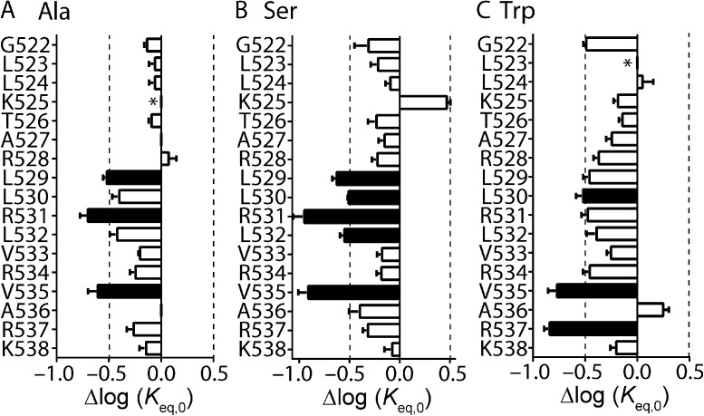 Figure 2. Scanning mutagenesis of the Kv11.1 channel S4 helix. (A–C) Shifts, relative to WT, in log(Keq,0) values for alanine (A), serine (B), and tryptophan (C) mutagenesis scans of S4 residues spanning from Gly522 to Lys538. Data are presented as means ± SEM for n = 3–20 cells (see Table S1). Dashed lines indicate Δlog(Keq,0) > ±0.5 log units, which has been shown previously to be the minimum perturbation required to derive an accurate Φ-value (Cymes et al., 2002; Wang et al., 2011). Mutations that fulfill this minimum requirement are indicated by closed bars, whereas mutations with Δlog(Keq,0) < 0.5 log units are indicated by open bars. *, mutant channels that failed to express or expressed poorly. |
