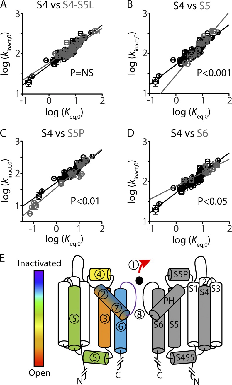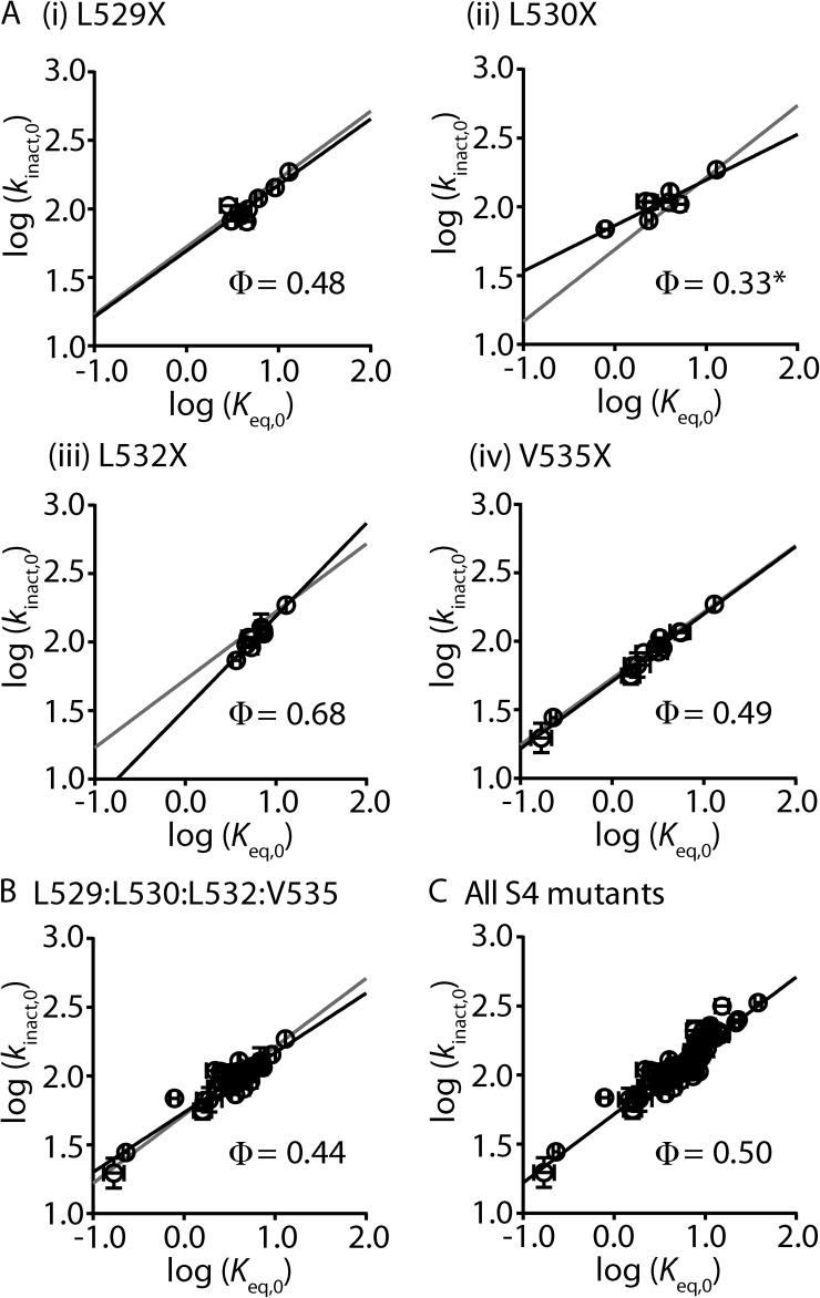 Figure 4. Mutation of S4 residues affects inactivation at a midway point during the transition pathway. (A) REFER plots of the log forward unidirectional rate constant, log(kinact,0), against the log equilibrium constant, log(Keq,0), for inactivation, in families of mutations at individual residues: i, Leu529; ii, Leu530; iii, Leu532; iv, Val535. (B and C) REFER plots for all mutations at Leu529, Leu530, Leu532, and Val535 combined (B) or all S4 residue mutations (C). Data are presented as means ± SEM for 3–14 cells. The slope of the linear regression analysis (solid black lines) for each family of mutations represents the Φ-value, as indicated, and can be compared with the slope for all other S4 mutations (solid gray lines). ANCOVA was used to determine statistical significance; *, P < 0.05. |