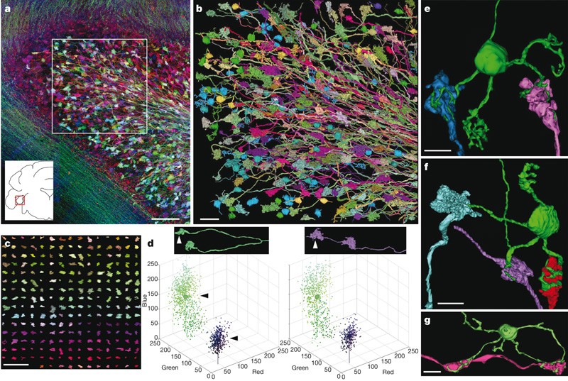 Figure 5: Cerebellar circuit tracing and colour analysis. a, Cerebellar flocculus from line H. Inset shows coronal location. b, Three-dimensional digital reconstruction of region boxed in a (341 axons and 93 granule cells; 160 μm2 × 65 μm). (See also Supplementary Movie 1.) c, Colour distribution of rosettes. Each rosette from the reconstructed region is aligned according to hue. d, Colour constancy along axon. Top: two mossy fibre axons (green, purple) each possess two presynaptic rosettes. Bottom: pixel distribution for each rosette (R, G and B intensities displayed on a scale from 1 to 255). The left graph displays upper rosettes for each axon (arrowheads); right graph displays corresponding lower rosette. e, Reconstructed granule cell receives input from ≥3 different mossy fibres (blue, pink and at least 1 unlabelled). The granule cell axon projects upwards. f, Each granule cell dendrite is innervated by a different presynaptic neuron (three labelled, one unlabelled). g, Two granule cell dendrites are innervated by the same presynaptic mossy fibre. Scale bars: a, c, 50 μm; b, 15 μm; e–g, 5 μm.