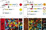 Figure 2: Brainbow-2: stochastic recombination using Cre-mediated inversion. a, In Brainbow-2.0, Cre triggers inversion of a DNA segment flanked by loxP sites in opposite orientation. In 50% of cells, inversion should end in an antisense orientation and switch gene expression. b, HEK cells stably expressing CMV-Brainbow-2.0 produce RFP, and stochastically switch to CFP expression when transfected with Cre. c, The Brainbow-2.1 construct contains two tandem invertible DNA segments. Inversion (i–iii) and excision (iv, v) recombination events create four expression possibilities. d, Stable CMV-Brainbow-2.1 transfectants express nuclear GFP (nGFP). Cre recombination triggers expression of YFP, RFP or M-CFP. pA1 and pA2, SV40 and bGH polyadenylation signals. Scale bars, 50 μm.