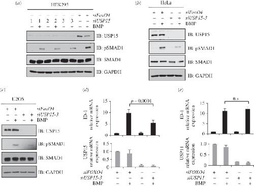 Figure 2. Depletion of USP15 inhibits BMP signalling. (a) HEK293 cells were transiently transfected with three individual siRNAs targeting USP15, serum-starved overnight and stimulated with 6.25 ng ml−1 BMP for 1 h prior to lysis. Extracts were resolved by SDS-PAGE and subjected to immunoblotting with antibodies against endogenous USP15, pSMAD1, SMAD1 and GAPDH. (b) As in (a), except that siUSP15-3 was used to knockdown endogenous USP15 expression in HeLa cells. (c) As in (b) except that U2OS cells were used. (d) HEK293 cells were transiently transfected with siUSP15-3. Cells were serum-starved overnight and stimulated with 6.25 ng ml−1 BMP for 1 h. Cells were then washed and harvested 2 h later. The expression of USP15 and the BMP-target gene ID1 were assessed by qRT-PCR. Results are average of six biological replicates. The error bars indicate s.d. (e) As in (d), except that HEK293 cells were transfected with siUSP11. The expression of USP11 and ID1 were assessed by qRT-PCR. Results are average of three biological replicates. The error bars indicate s.d.